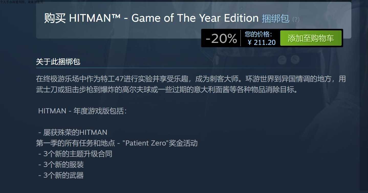 本商品的年度版是Steam上的HITMAN™ - Game of The Year Edition 杀手1年度版本,包含游戏的所有关卡。