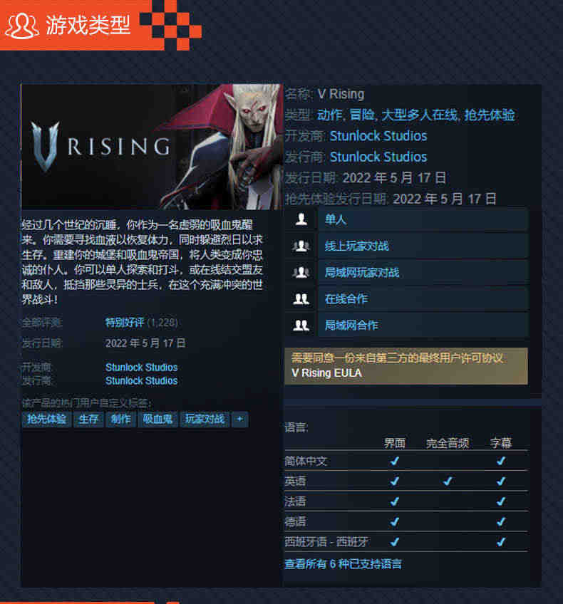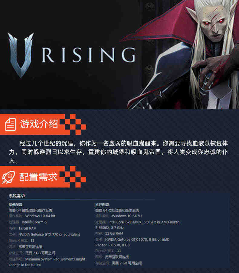 V Rising是一款中文正版的Steam游戏,包含德古拉的遗物DLC和创始人礼包:最古老的血统。这是一款吸血鬼题材的游戏,玩家可以扮演吸血鬼,在黑暗的夜晚展开战斗,建立自己的城堡和帝国。该游戏有多种玩法,包括探索、战斗和建筑。同时,该游戏支持修改器,方便玩家根据自己的喜好进行调整。
