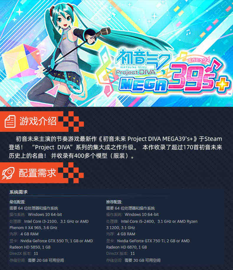 【普通版】 Project DIVA MEGA39’s+ 游戏本体 239元版本 Steam官方正版激活码 秒发