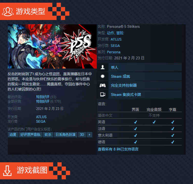 《女神异闻录5乱战魅影攻手》是一款在PC上运行的中文正版steam游戏,简称P5S或女神异闻录5S。它是一款动作RPG游戏,玩家可以控制多个角色在各种场景中战斗和探索。游戏的战斗系统和画面都非常精彩,特别是各种技能和连招的组合,让玩家可以体验到超炫的打击感和视觉效果。此外,游戏中还有丰富的剧情和角色发展,使得整个游戏变得更加有深度和魅力。如果你喜欢动作游戏和日式角色扮演游戏,那么P5S绝对是一款不容错过的游戏。此游戏为国区激活码cdkey版本,方便快捷。