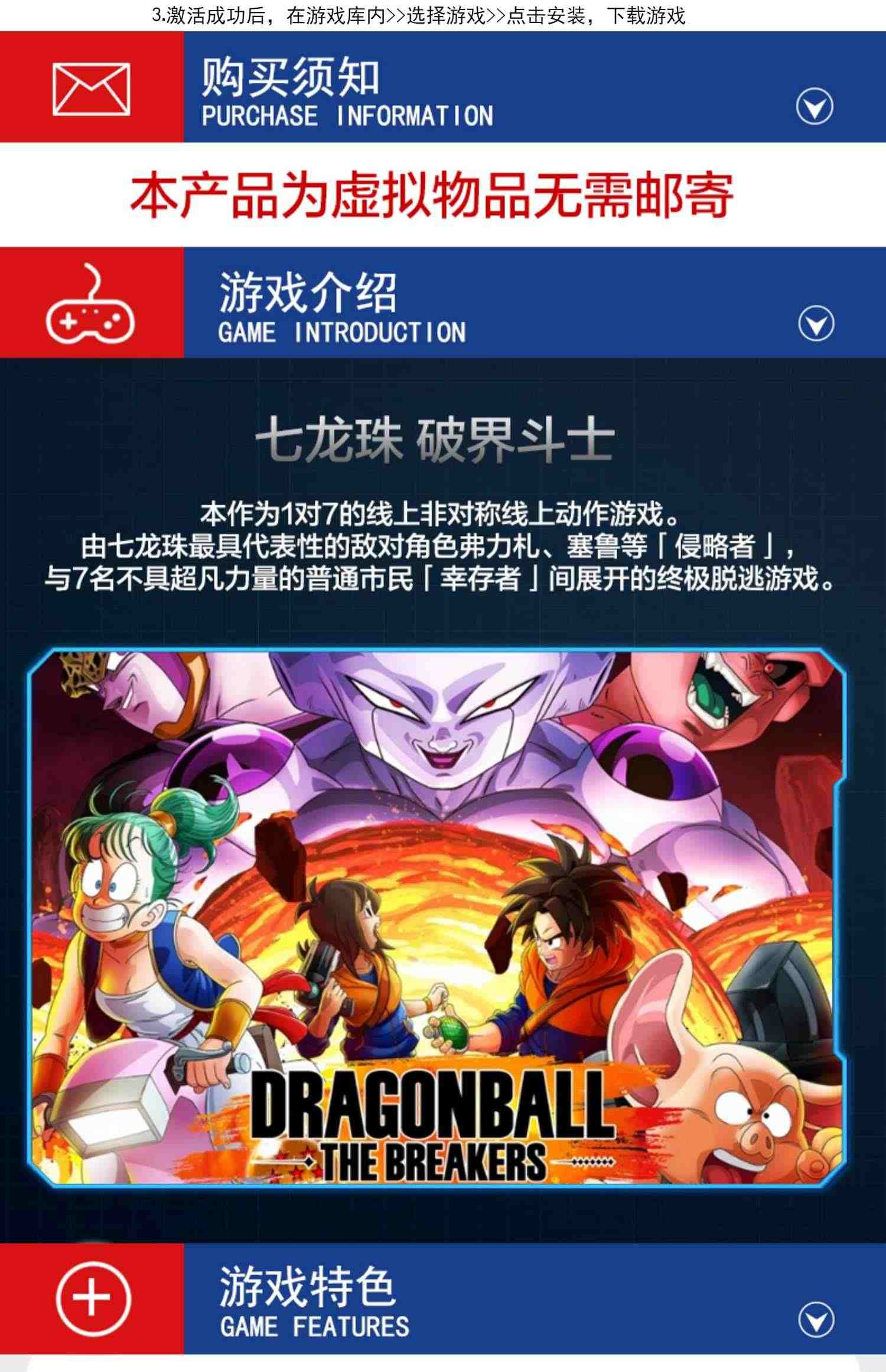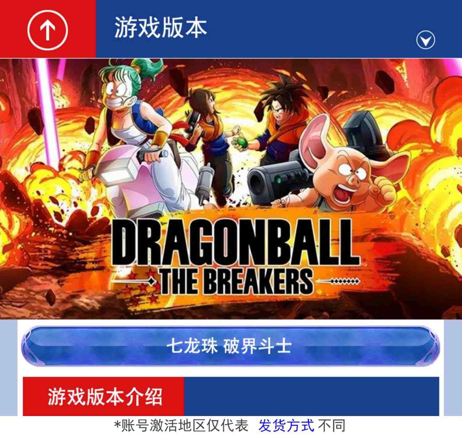 《七龙珠破界斗士 DRAGON BALL THE BREAKERS》是一款适合喜欢动漫、对战和生存游戏的玩家的游戏。在这款游戏中,玩家可以选择自己喜欢的七龙珠角色,与其他玩家展开对战,生存并最终成为胜利者。游戏支持多人在线游戏,可以与来自不同地区的玩家一起玩。本产品是国区激活码,适用于PC。