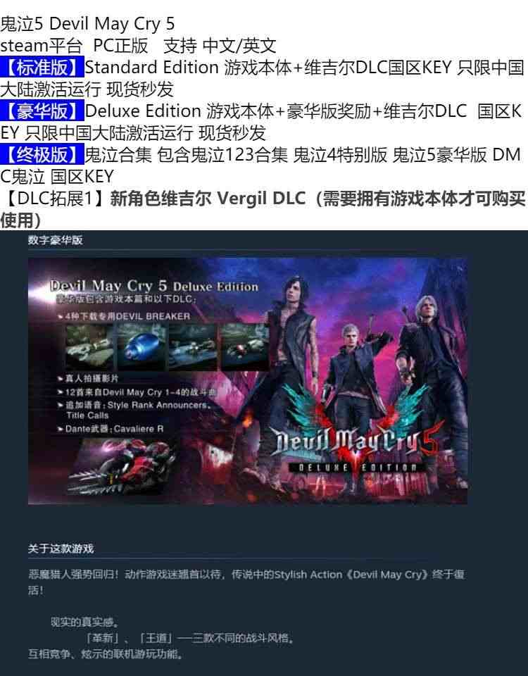 这个维吉尔DLC是这个游戏的一个扩展内容,允许您玩家一个全新的游戏角色。同时,鬼泣合集包括鬼泣1234特别版,这些都是非常受欢迎的游戏,也被许多人认为是动作游戏的经典之作。