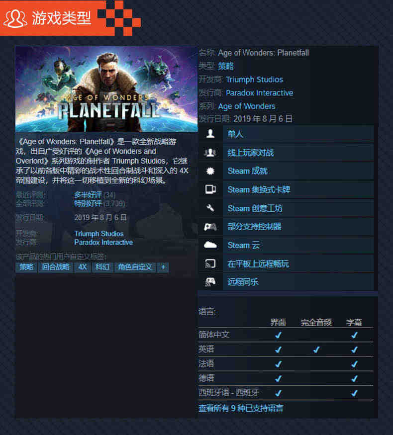 Age of Wonders: Planetfall是一款策略类游戏,支持单人和多人模式。游戏中,玩家需要在一个全新的星球上建立自己的文明,与其他文明进行战争或外交交流。玩家可以选择不同的种族和领袖,每个种族和领袖都有独特的特点和技能。玩家需要管理资源、建造城市、研究科技、招募军队等等,以扩展自己的势力范围。