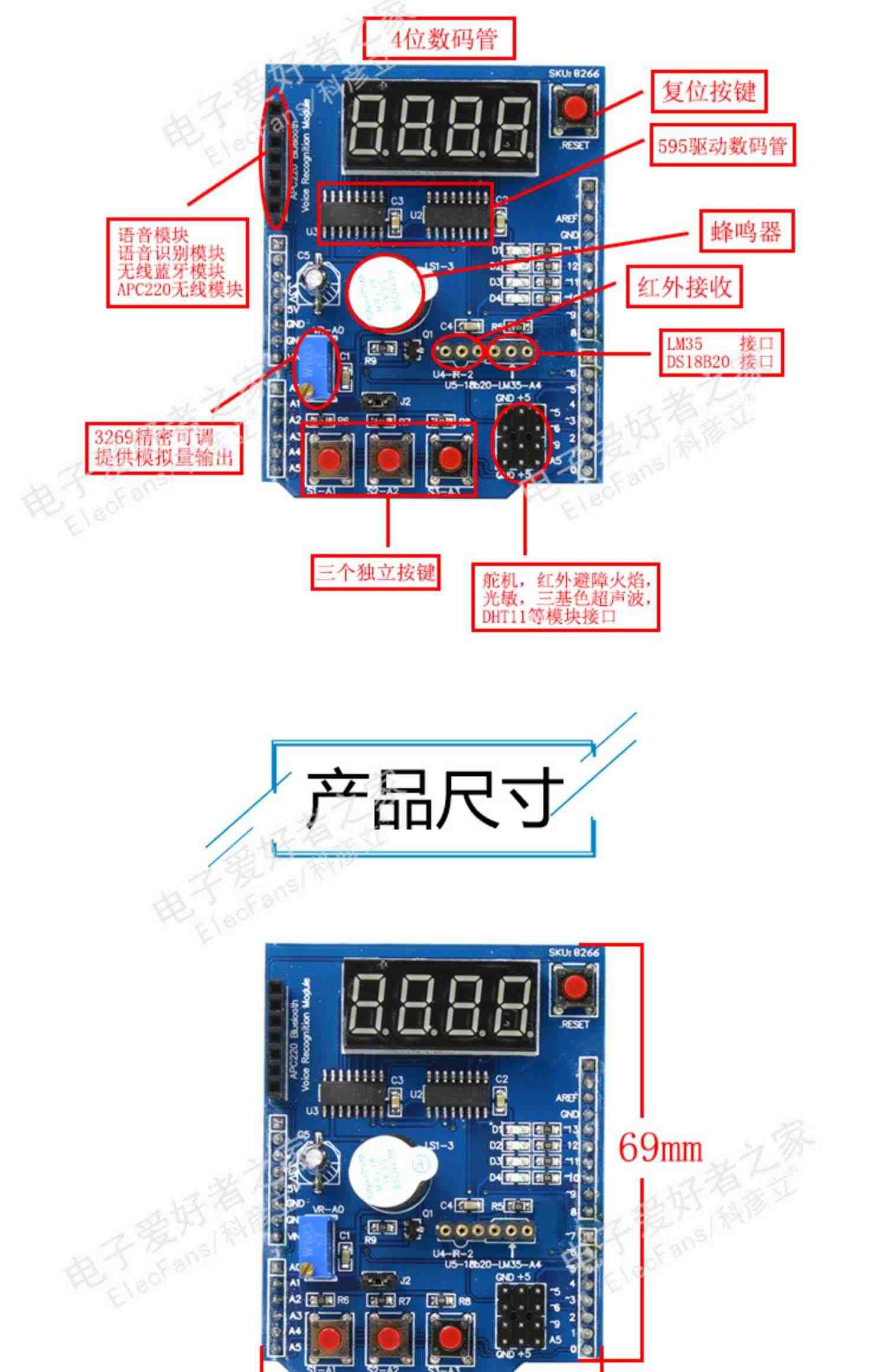 该扩展板具备多种常用驱动组件和模块,如蜂鸣器、LED灯、按键、电位器等,同时还支持LCD显示器和红外遥控器等外部设备的连接。这使得它能够用于各种电子项目的开发和实验,从简单的小程序到更为复杂的系统都可以轻松实现。