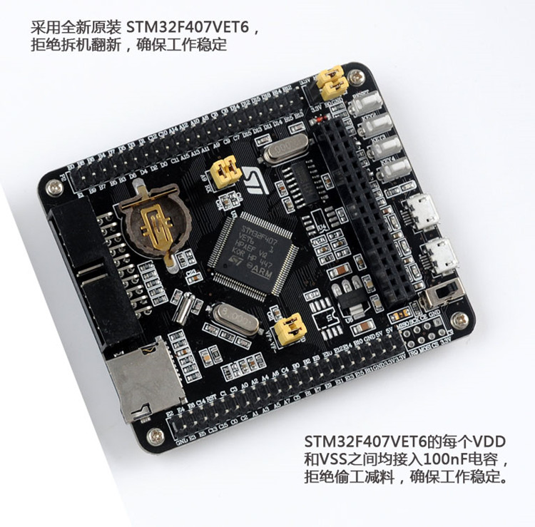 这款STM32F407VET6开发板是一款Cortex-M4 STM32小系统板,适合进行arm开发。它有着多种接口和扩展槽,能够满足不同的开发需求。使用该开发板,你可以进行多种实验和项目,如物联网应用、机器人控制和传感器读取等。它的稳定性和性能都非常出色,可以满足高要求的应用场景。如果你是一名有经验的开发者,这款开发板将是你的不二选择。