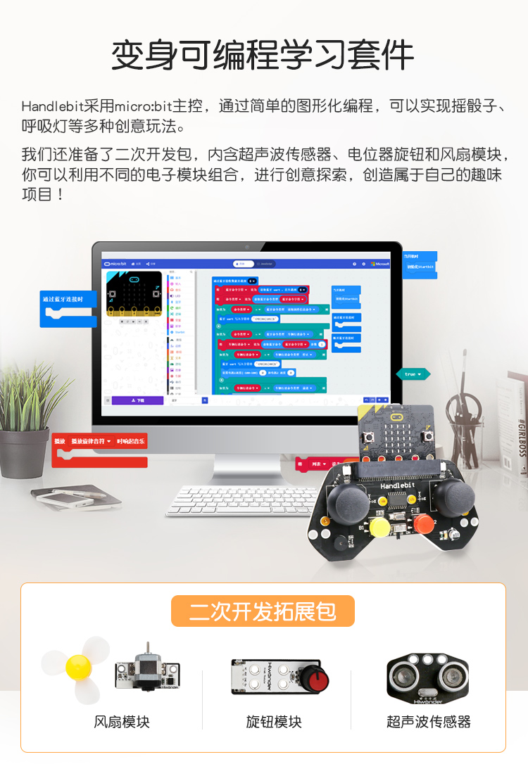 这是一款名为七星虫的Microbit Python学习套件,适用于Microbit编程入门开发板。该套件包含了各种有趣的传感器和模块,如温度传感器、光线传感器、声音传感器等等,可以用来创建各种有趣的项目,如音乐播放器、智能警报器、智能灯光控制器等等。该套件还附带了详细的使用说明书和示例代码,即使您是完全的编程新手,也可以很容易地上手学习。不仅可以培养您的编程技能,还可以帮助您培养创造力和解决问题的能力。这是一款非常适合儿童、初学者或者爱好者的学习套件。