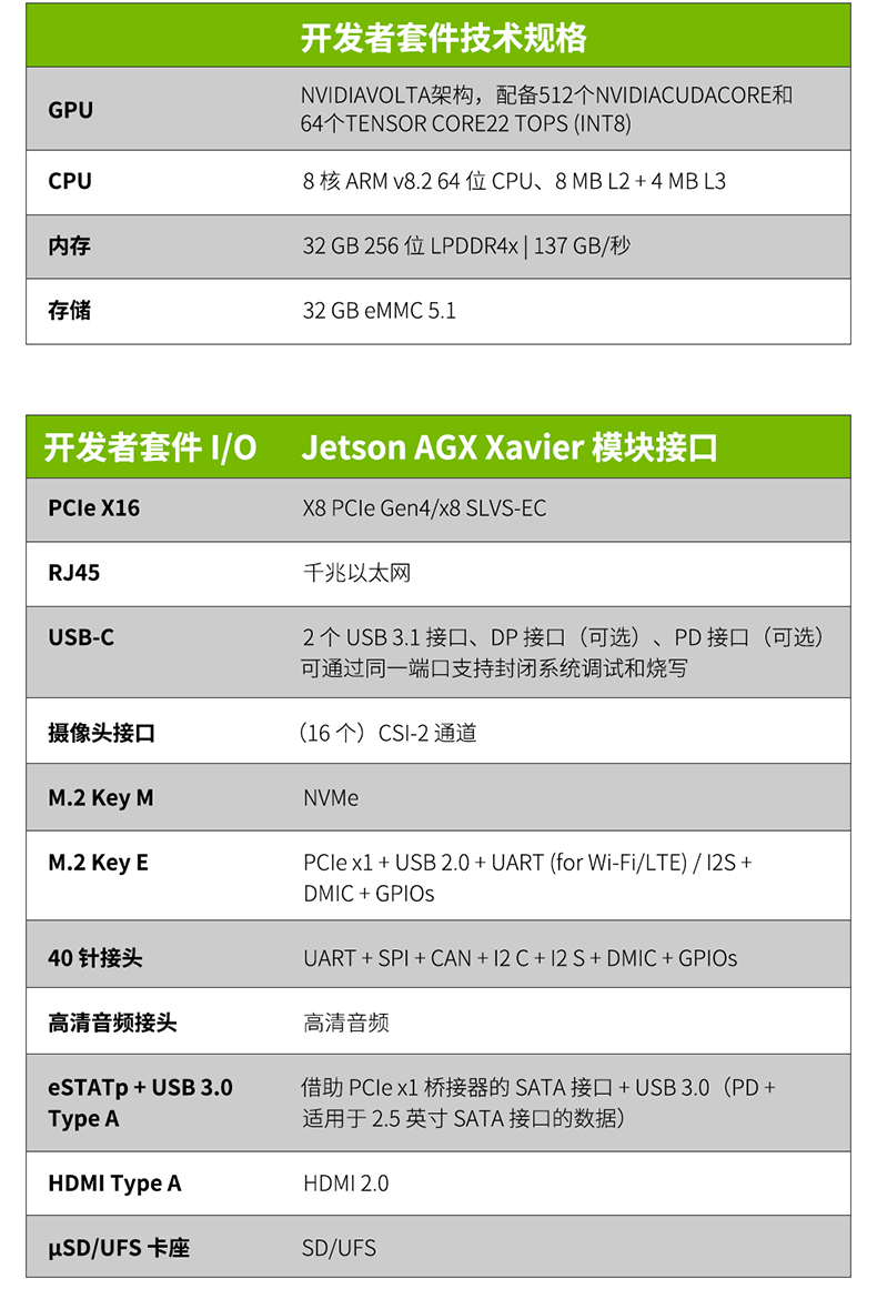 Jetson AGX Xavier开发板是一款适用于人工智能和深度学习的高性能计算设备,可用于各种AI应用,如机器人、自动驾驶、物联网等。它拥有多个高速接口和强大的GPU处理器,可以让你在不同的AI项目中快速实现高效计算。Jetson AGX Xavier开发板套件提供了一整套开发工具和文档,可以让你快速入门,进行深度学习、机器学习和计算机视觉等方面的应用开发。如果你是一名AI开发者,那么Jetson AGX Xavier开发板套件将是一个非常不错的选择,它可以帮助你轻松地实现各种AI应用,开创出更多的AI玩法。