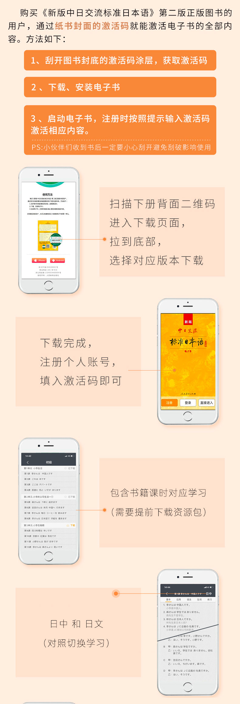 第二版*点:*心策划,*出品:中日双方编写者再次倾情奉献,*心设计,继续打造人教*品;与近期新版教材同步,适合新日本语**考试用书;手机阅读,离线使用:把《新版标准日本语》装进手机,出行学*不用背书,资源*单*下载,*随地无流量、离线学*;新版内容,轻松学*:非常不错语法解释,*良互动练*,让书本知识变得有声有色,让日语学*不再枯燥,实现轻松、快乐学*;内容全面,逐步更新:五十音图示范教学,课文、生词中日文对照,音视频与内容同步播放,*更新,让日语学**远学在前沿。