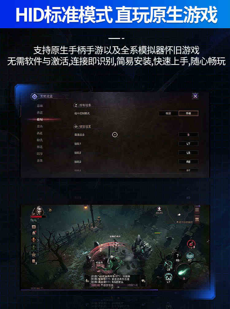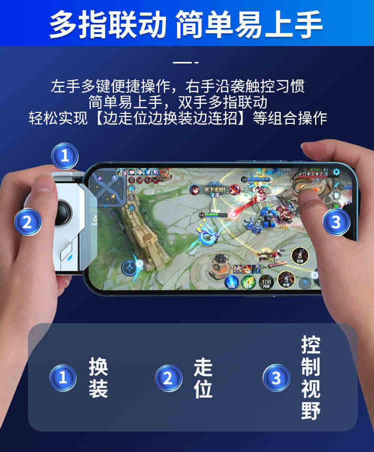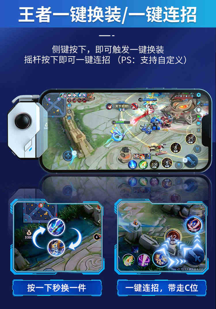 • 小巧不占位置,系统全兼容的可以玩任意游戏,拿到直接卡上链接蓝牙就可以了,王者可以一键连招和换装,超级不错,总体玩起来手感很好,主要连招可以录制摇杆了这个,真的很智能,超级方便,值得入手
