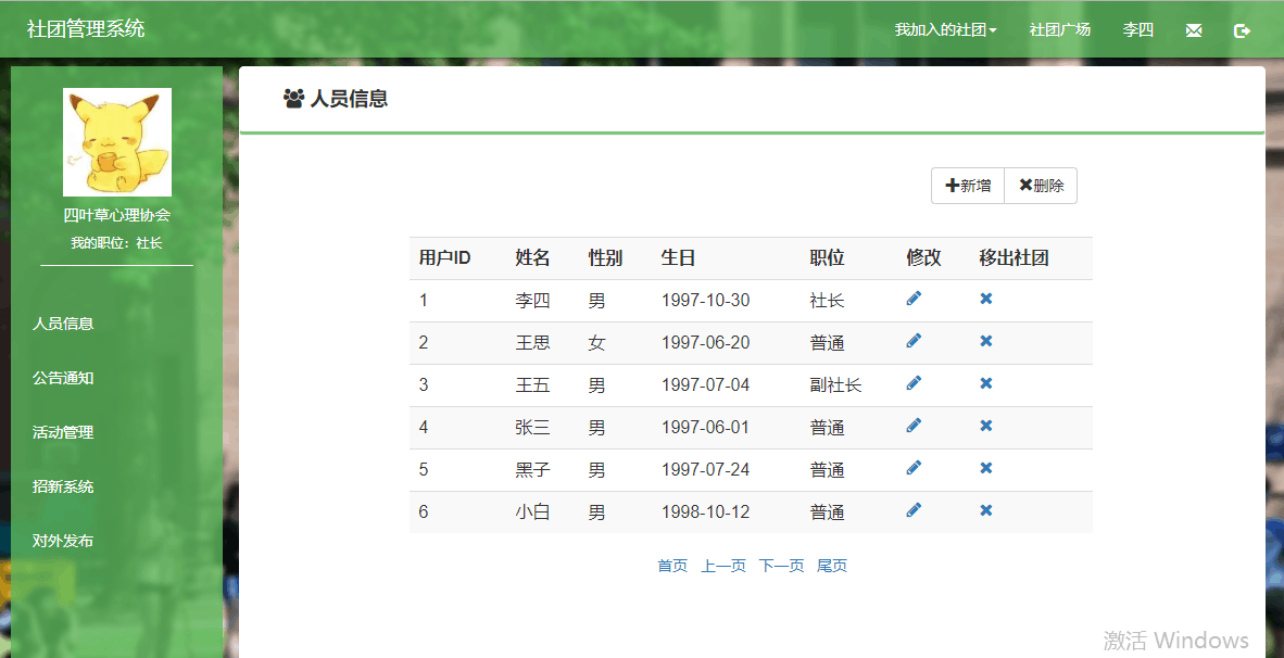 用户ID 姓名 性别 生日 职位 修改 移出社团