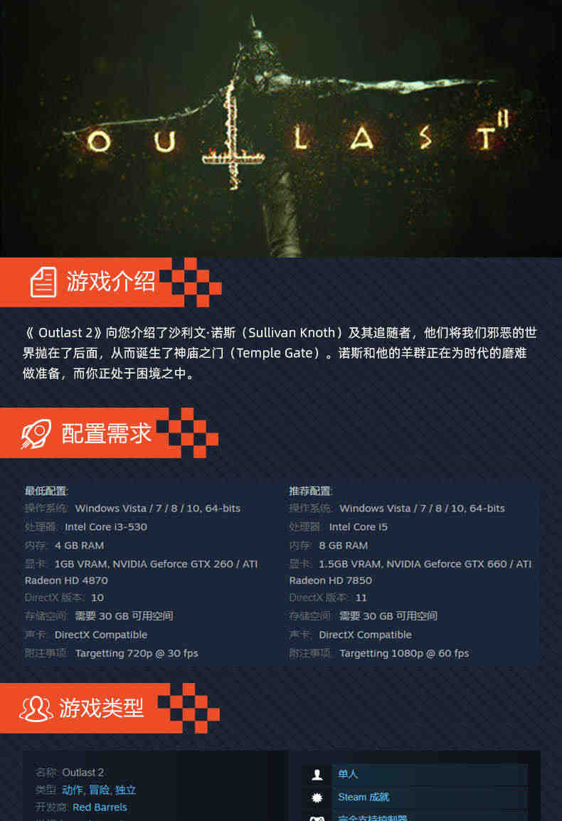 Steam游戏 PC中文正版 Outlast 2 逃生2 激活码