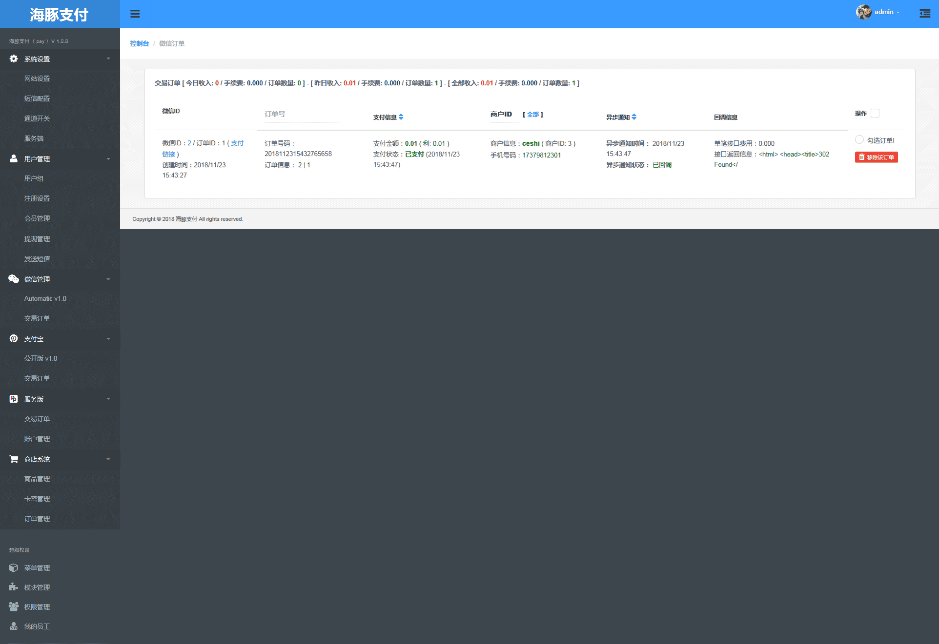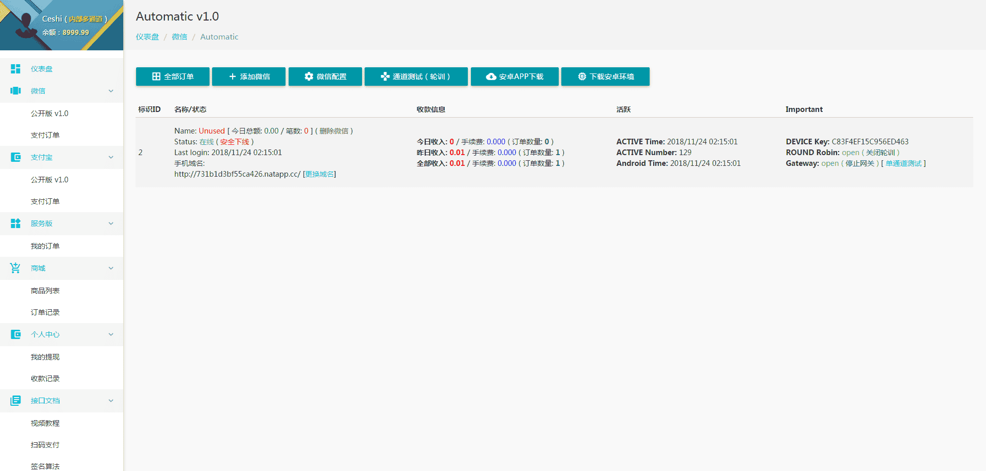 功能大概:上传二维码,云监控,订单记录,收款介绍,掉线短信通知(云端监控,只需掉线,都会有短信通知),回调接口扣手续费(可自行调手续费,或者给单个人设置手续费)