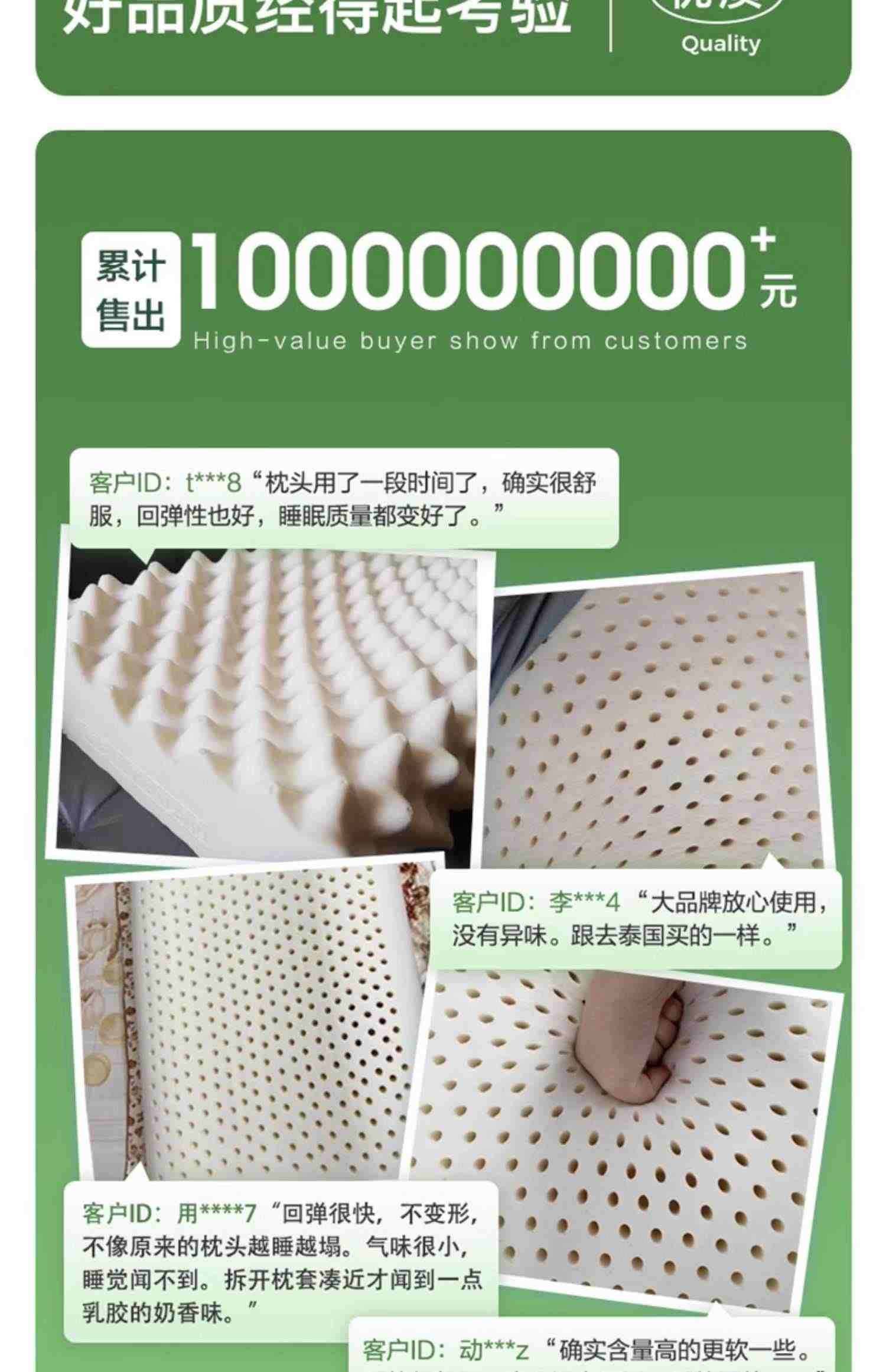 • 外观与质量:乳胶枕头外观精美,做工精细,质量很好。 材料舒适度:乳胶材料非常舒适,触感柔软而支撑力又足够,睡上去非常舒服。 透气性能:乳胶枕头具有良好的透气性能,使用一段时间后依然保持通风性良好。 高低度可调节:乳胶枕头的高低度可调节,适合不同睡眠姿势和个人需求。 健康环保:乳胶枕头采用天然材料制作,无毒无味,对皮肤友好,并且抗菌防尘螨。 清洗简便:乳胶枕头可拆洗,清洁方便快捷。 客服服务:卖家的客服态度很好,提供了专业的咨询和解答,并且发货速度快。 性价比:综合来看,该款乳胶枕头性价比较高,物有所值。