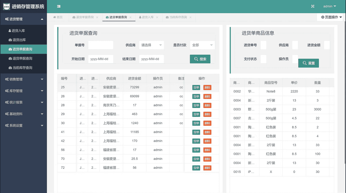 进货单号 供应商 付款状态 进货总金额 操作员 操作