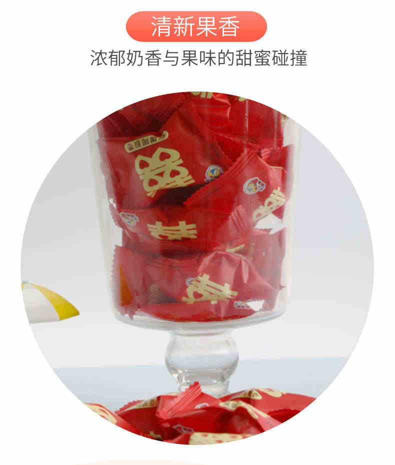 • 口感味道:味道还是比较好吃的,甜度适中 我们是用来婚礼的喜糖的,这种糖也比较好看,比较大气,而且还很好吃 商品分量:分量就和它标注的差不多,我数了两袋,都是37 38个,足量!可以冲