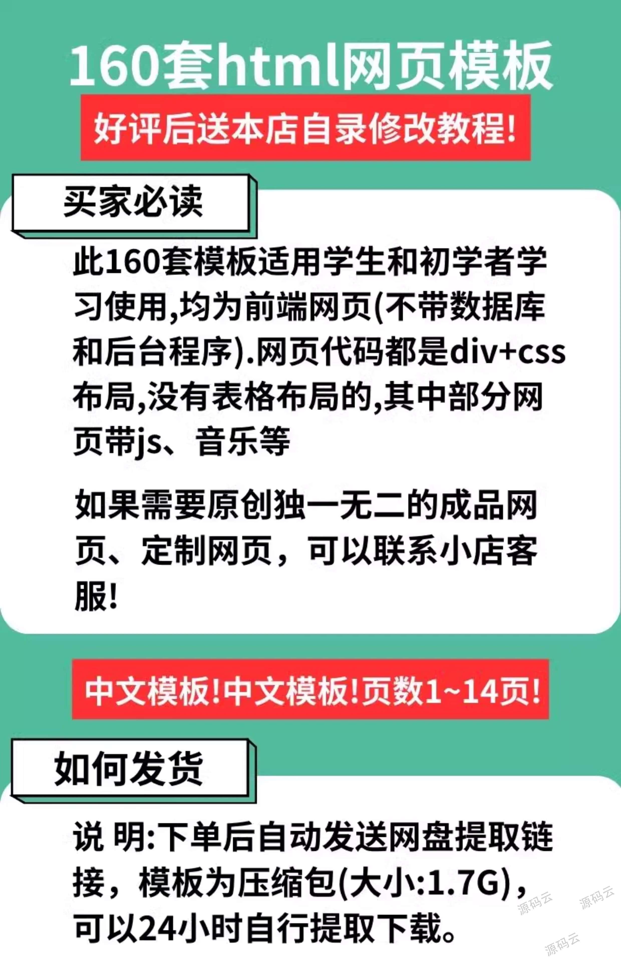 此160套模板适用于学生和初学者学习使用,均是前端网页(不带数据库和后台程序)。网页代码都是div+css布局,没有表格布局的,其中部分网页带有js、音乐等。如果需要原创一无二的成品网页、定制网页,可以联系小店客服!