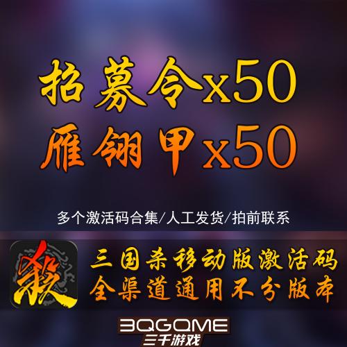 【商品类型】三国杀(移动版)礼包 【礼包内容】一律取得,招募令50,雁翎甲50 【发货时间】拍下后10秒钟发送兑换码到您购买者QQ聊天窗口,注意查收。 【购买帮助】购买过程中出现游戏区服可以随意写,不影响最终发送卡密给您。 【使用须知】多个礼包激活码合集,没有使用过激活码的可以直接拍。一号一次多买用不了。 【使用说明】游戏内>右下角点 号>激活码