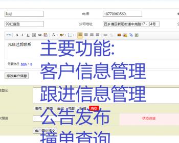主要功能:用户分类,重点用户,意向用户,潜在用户,已拜访用户,并且可以根据跟进信息进行填写,包含下次跟进事件,用户清空详情,用户需求填写,跟进信息展现。声明信息,管理员发布声明信息,业务员可以前端查看